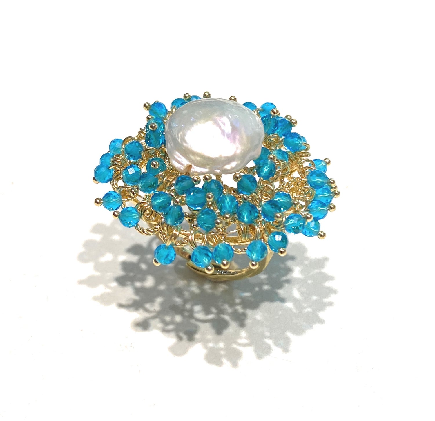 Anello Regolabile con Perla Freshwater e Pietre Azzurre Galvanica Oro