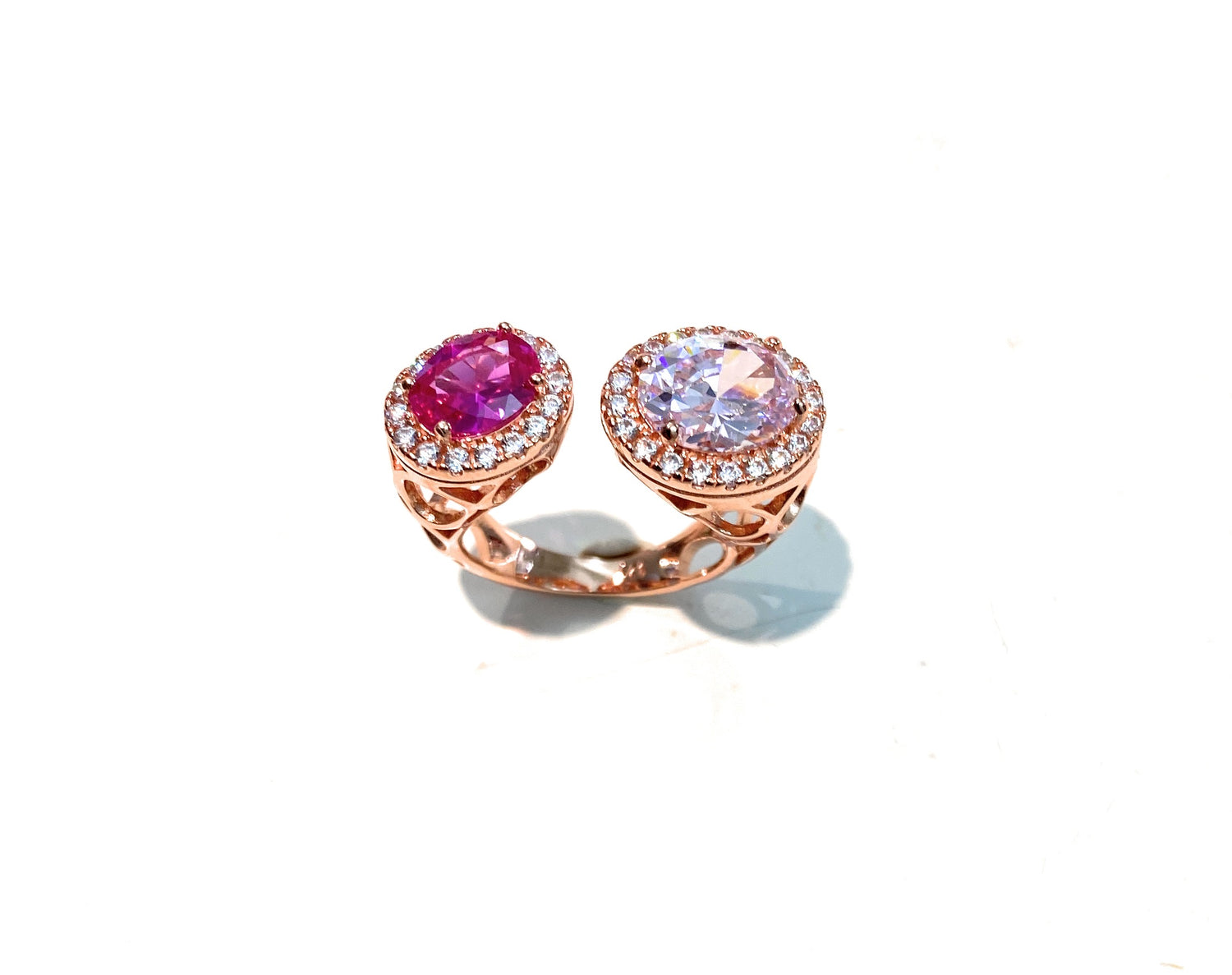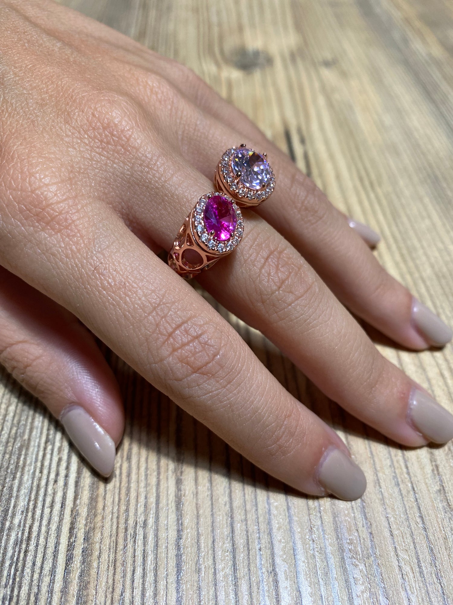 Realizzato in argento sterling 925 con una delicata galvanica rosé, l’anello presenta due zirconi ovali sfaccettati, uno in tonalità fucsia intensa e l’altro rosa più tenue, che si completano in un abbraccio armonioso e luminoso.