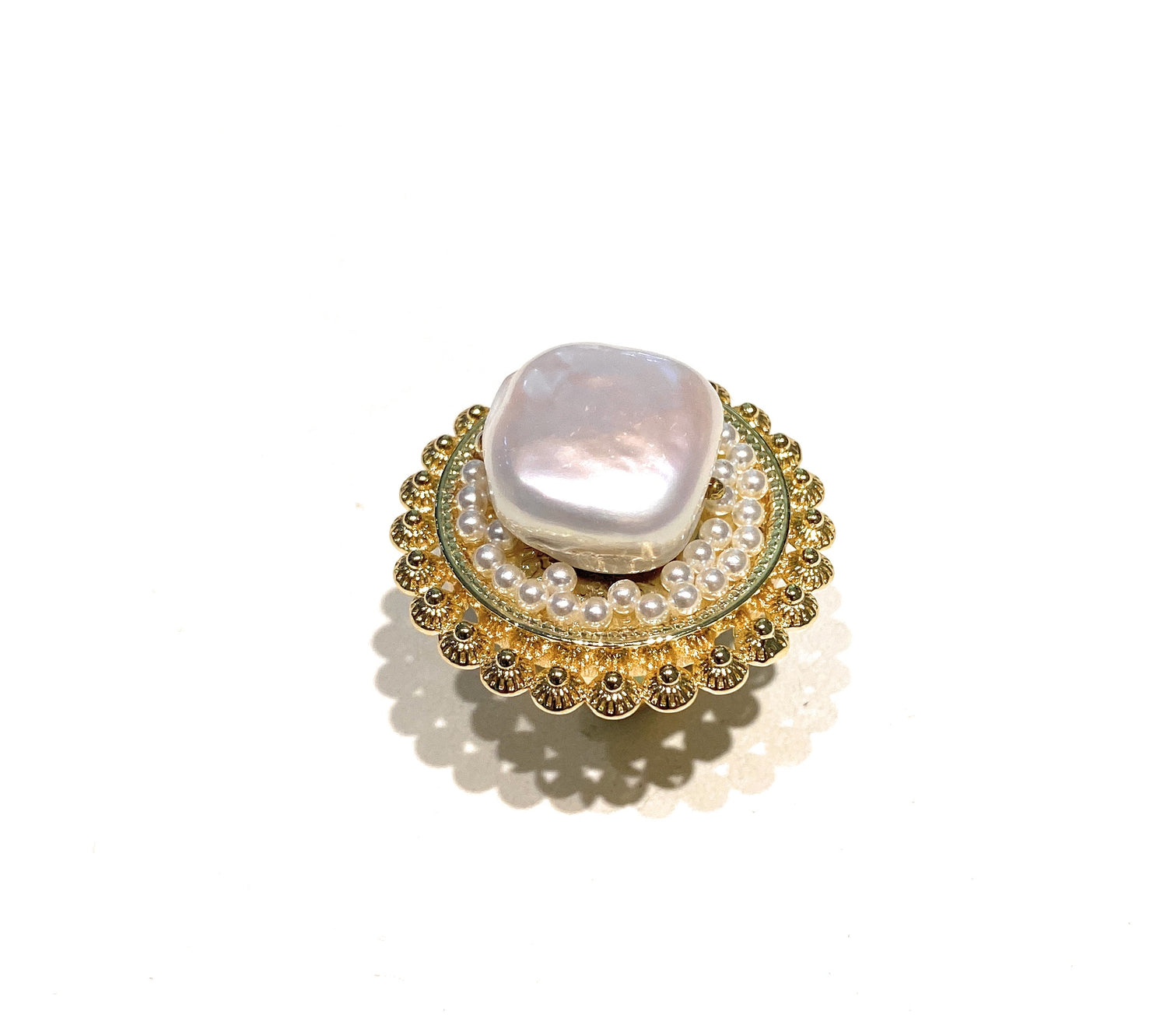 Questo anello è realizzato in bronzo con galvanica gialla e decorato con una perla barocca bianca dalla forma carré piana, unica per la sua naturale irregolarità.