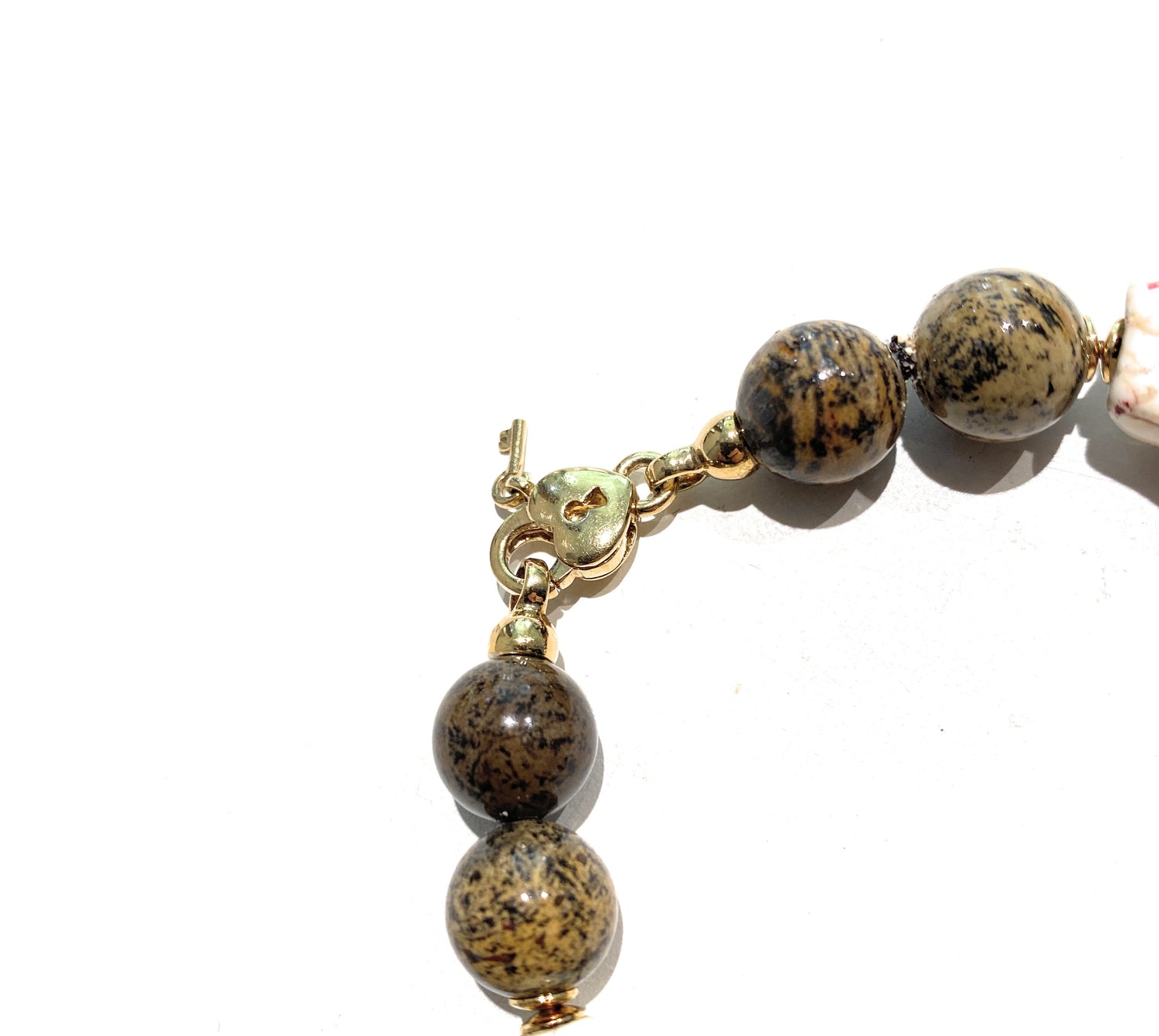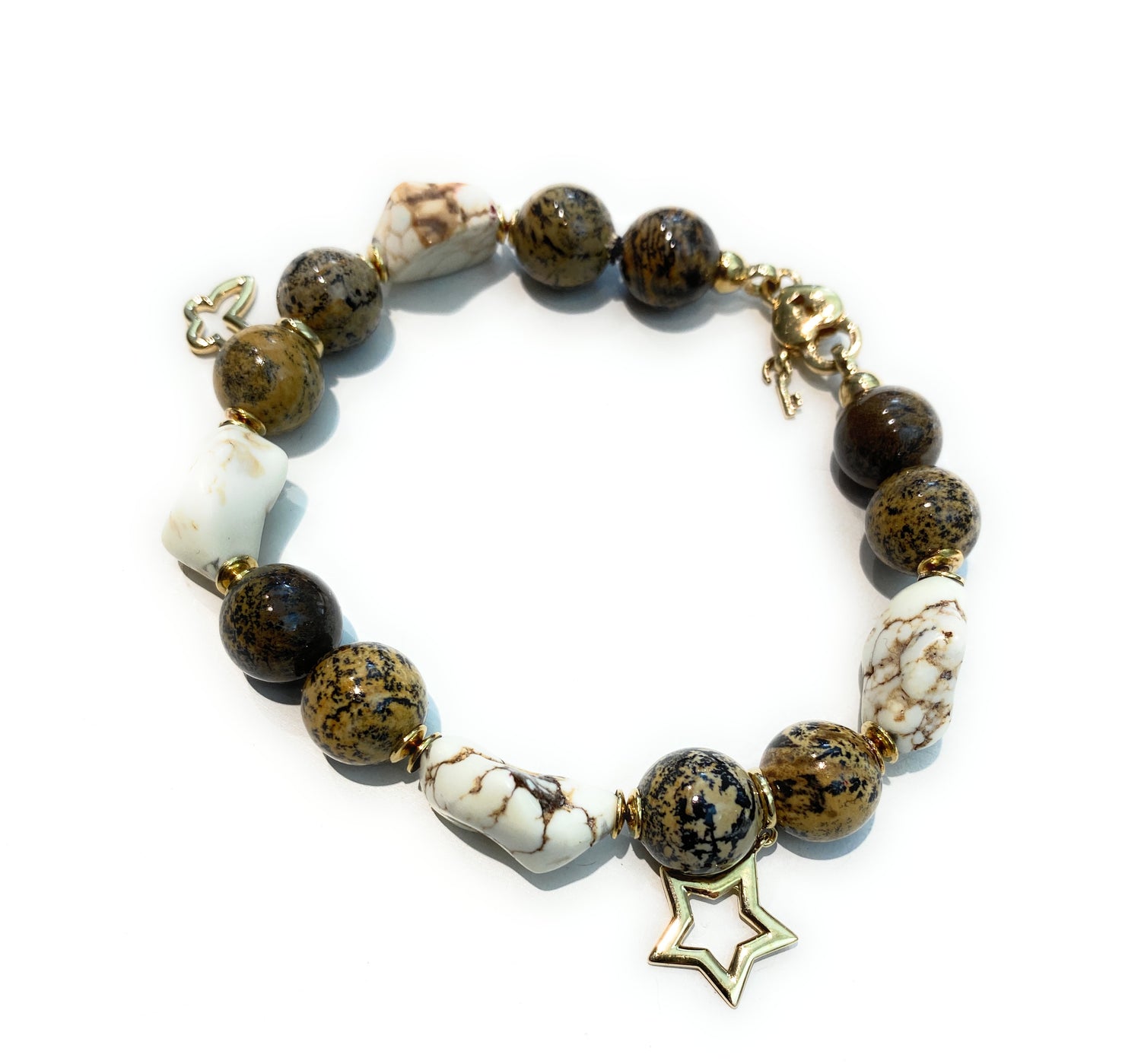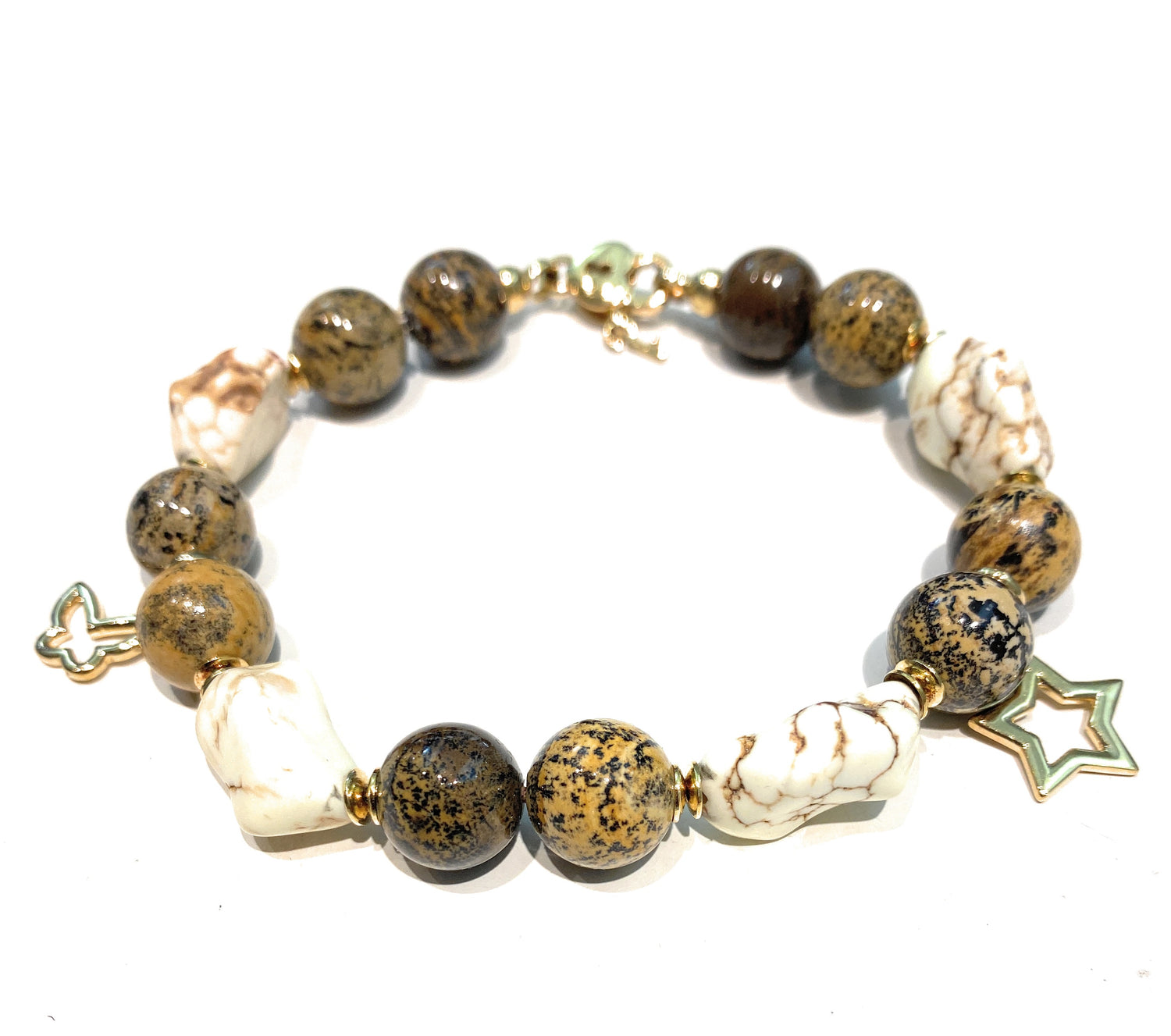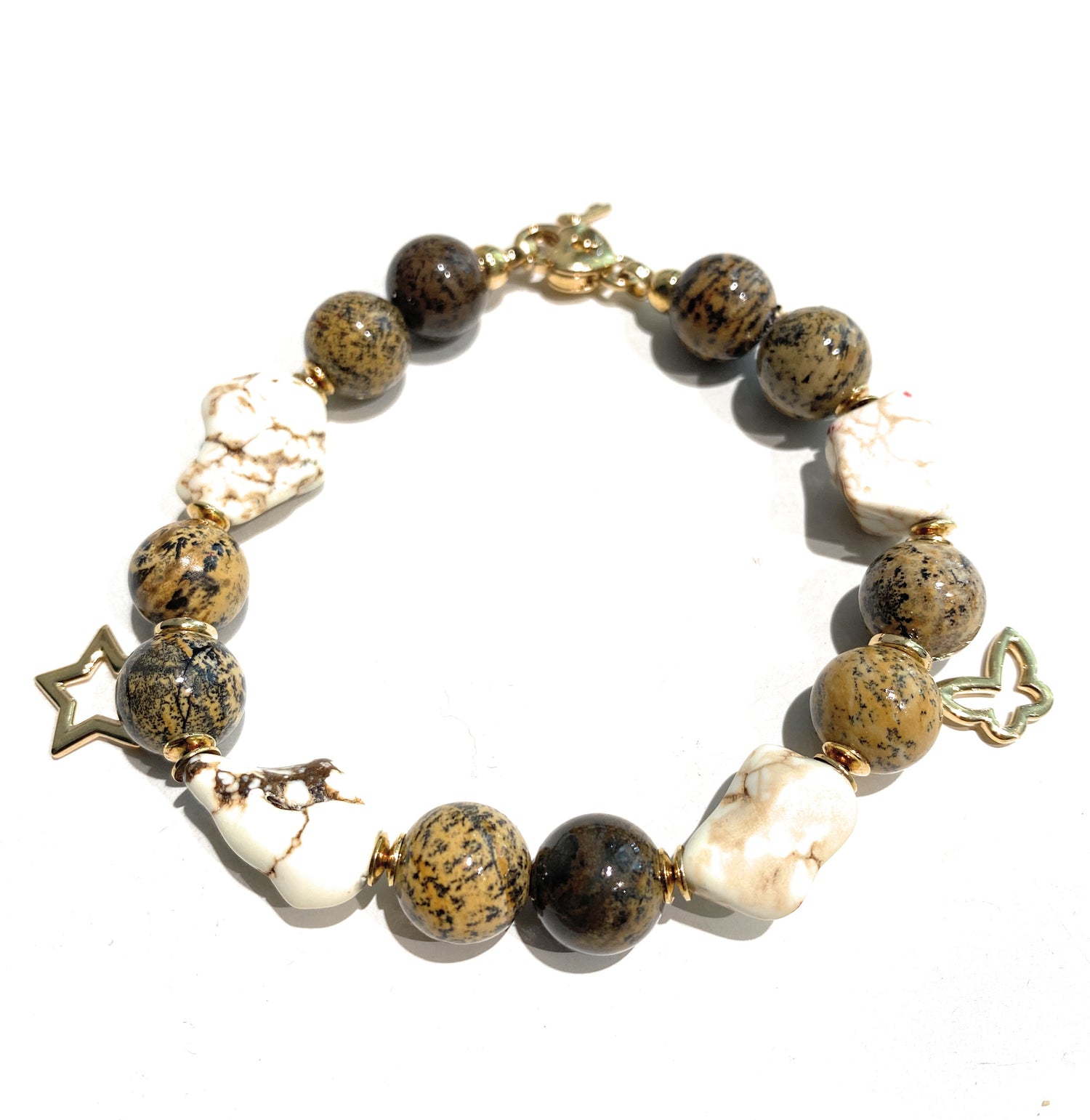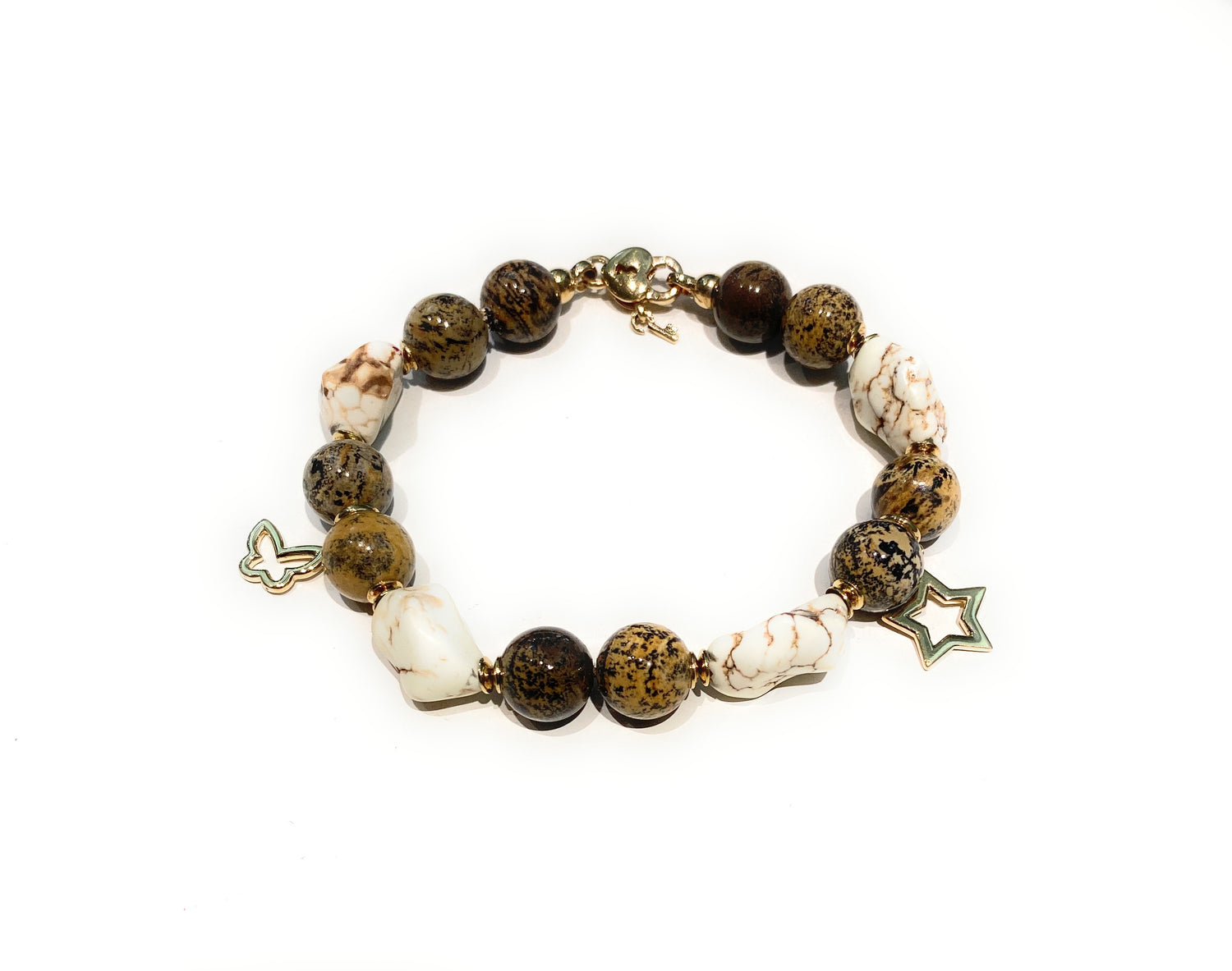 Il diaspro artic, con le sue sfumature eleganti, e la howlite bianca dalle forme morbide si alternano con armonia, impreziositi da due charm simbolici – una stella e una farfalla – che donano un tocco personale e raffinato.
