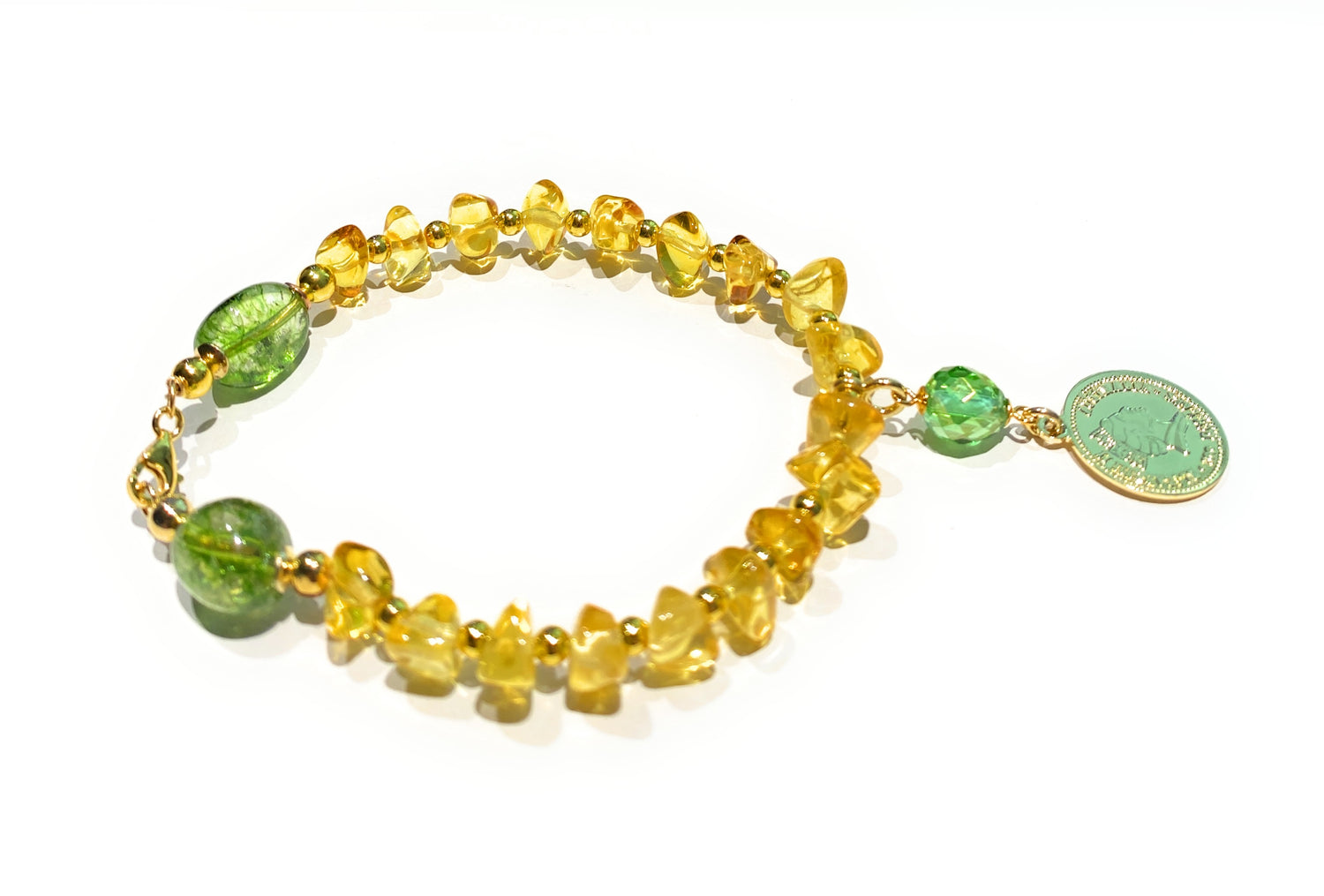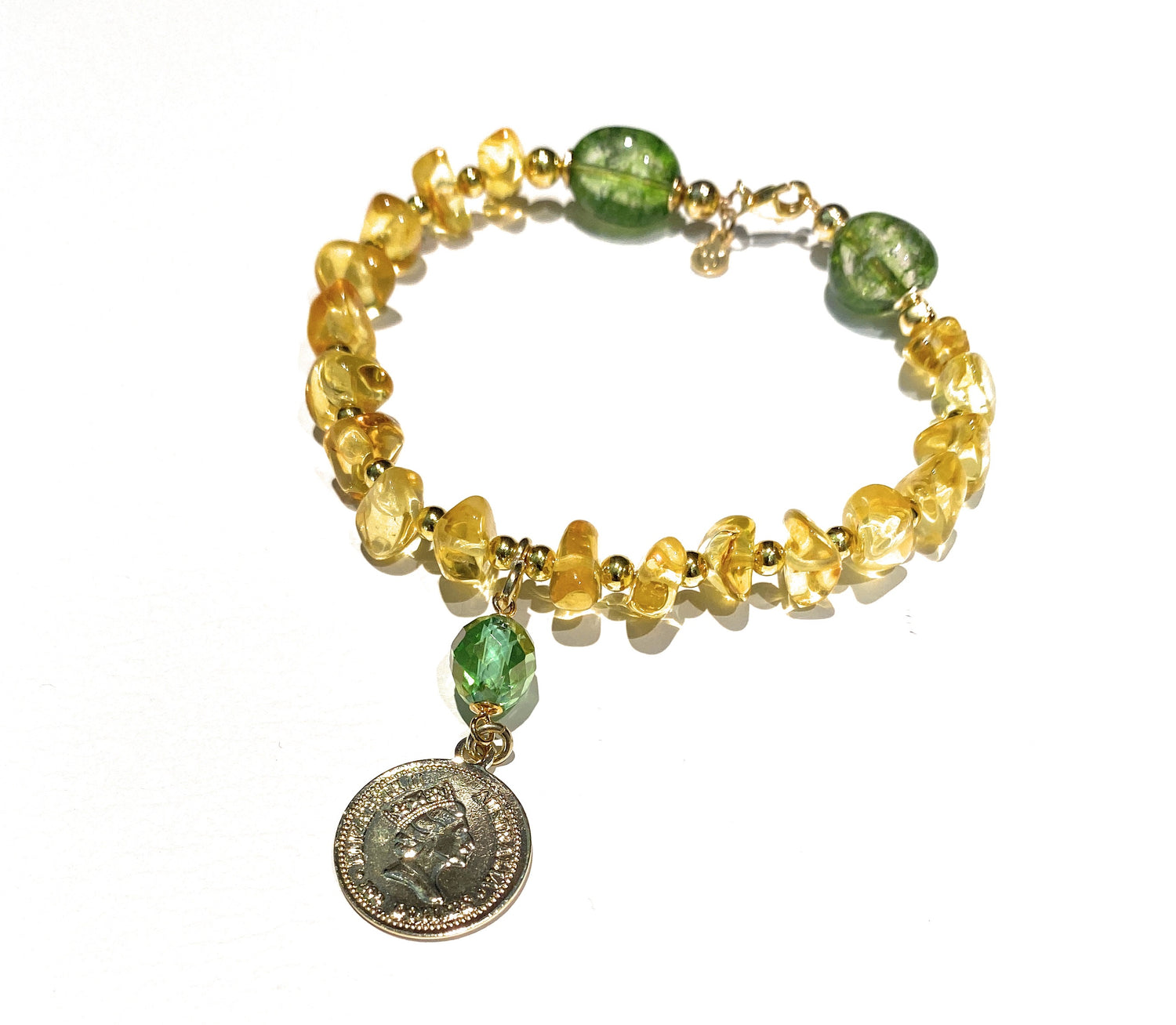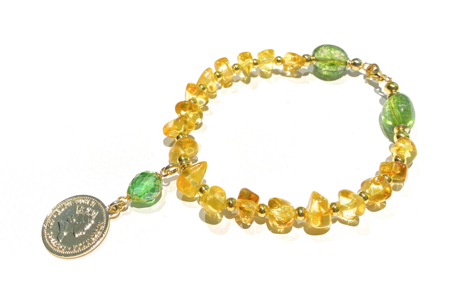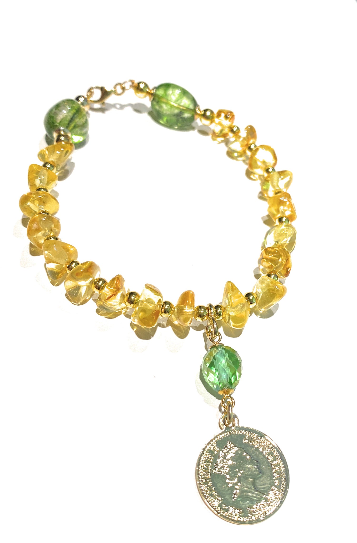 Bracciale Ambra Naturale & Cristalli Verdi con Charm Moneta Oro Giallo diWa Jewels