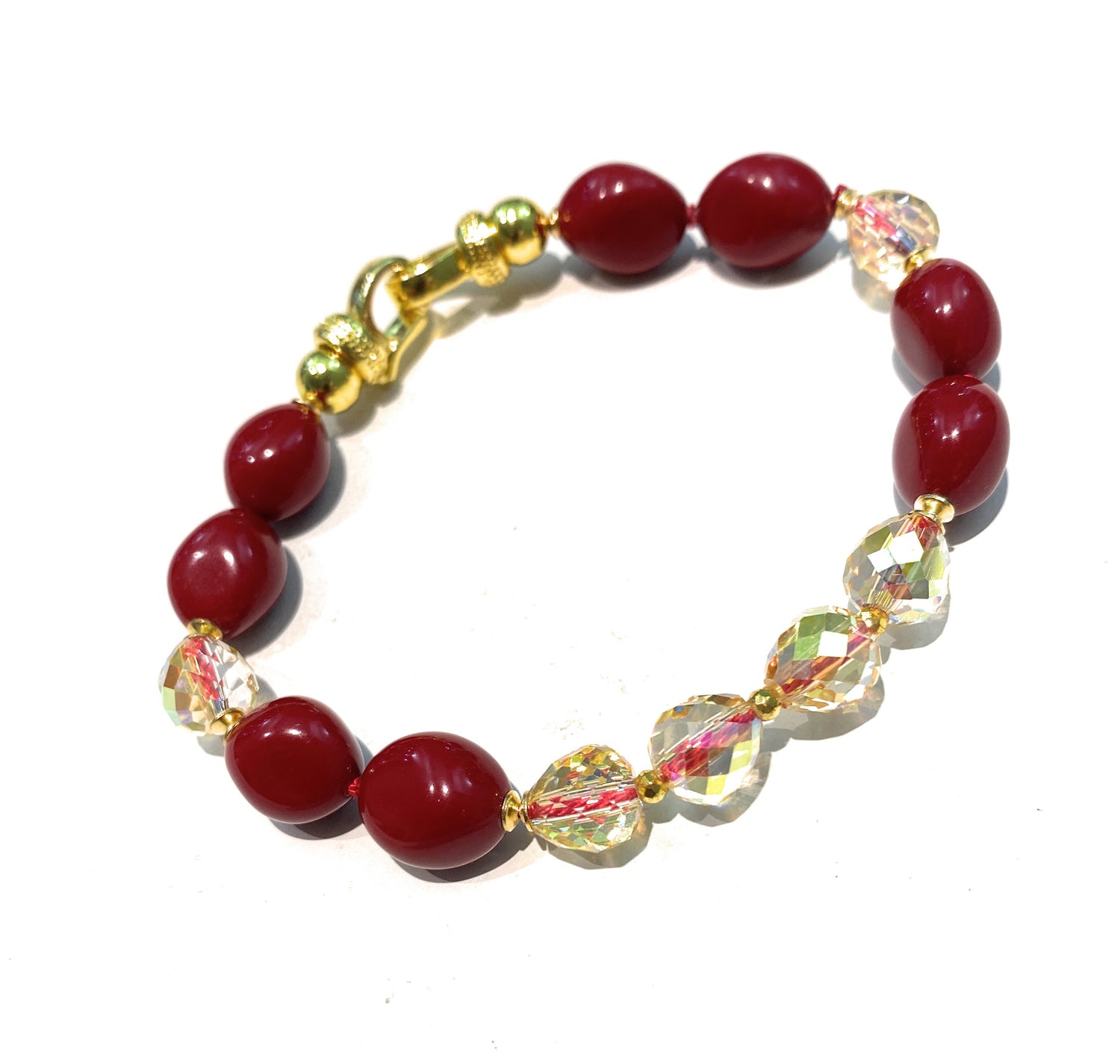 Un gioiello vivace e sofisticato, che esprime tutta la forza e il calore del rosso corallo unito alla luce dorata dei cristalli. Questo bracciale firmato diWa Jewels è realizzato a mano, con materiali pregiati e finiture curate nei minimi dettagli.