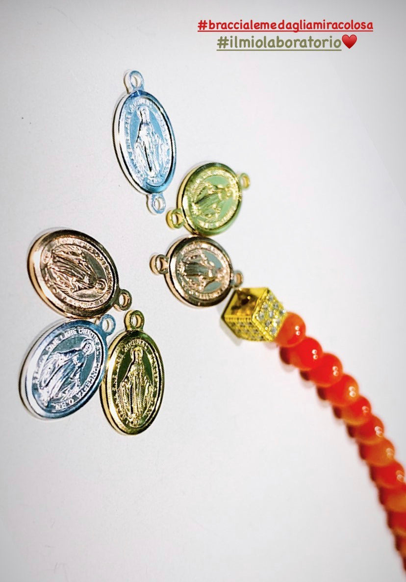 Il gioiello è impreziosito da un centrale con medaglia della Madonna Miracolosa e pietre dure in conchiglia arancio, per un effetto luminoso ed elegante.