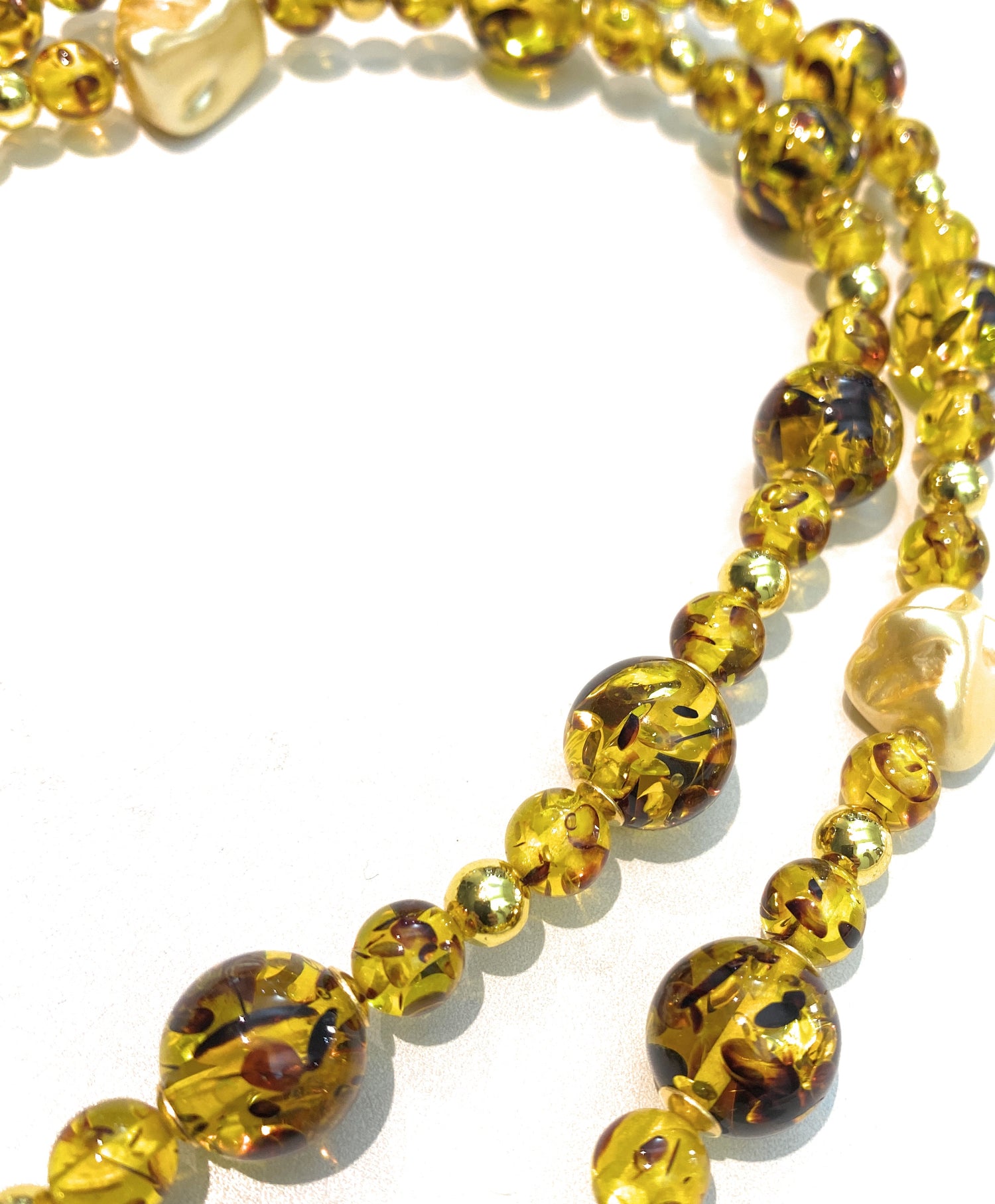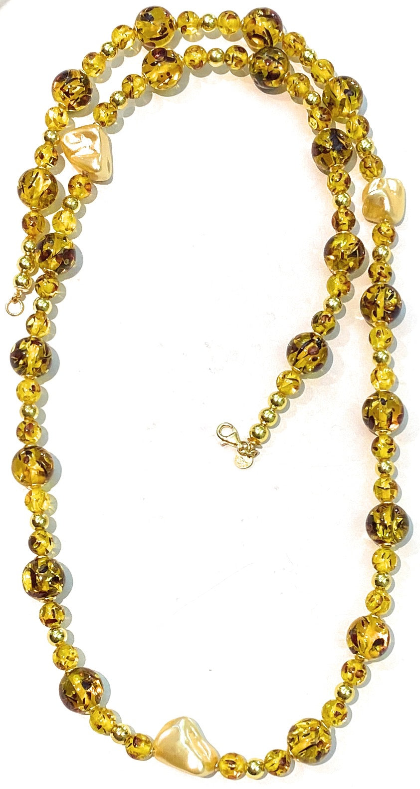 Collana Lunga diWa Jewels resina Ambra ematite e Perle Barocche gold argento sterling