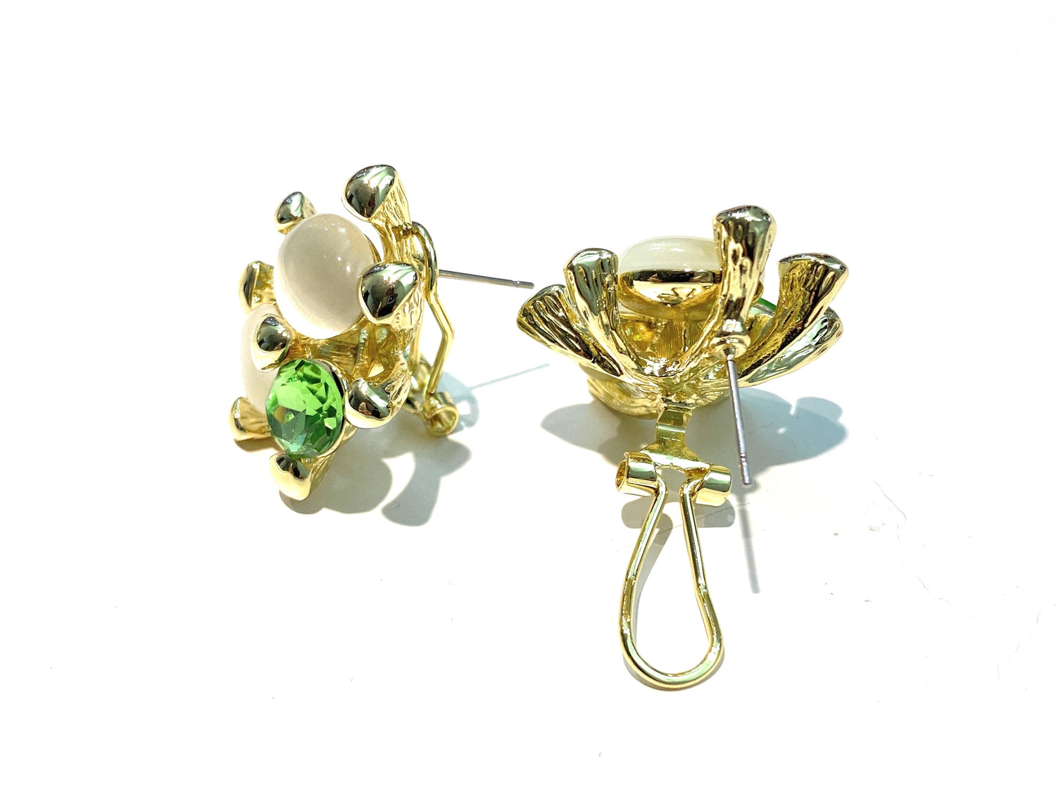 Orecchini a lobo di grande impatto visivo, dallo stile elegante e delicatamente retrò. Realizzati in bronzo placcato oro giallo, presentano cabochon dai toni verde acqua e rosa cipria, che si fondono armoniosamente per creare un accessorio raffinato e di classe. La chiusura con perno e clips garantisce comfort e stabilità anche su lobi non forati.