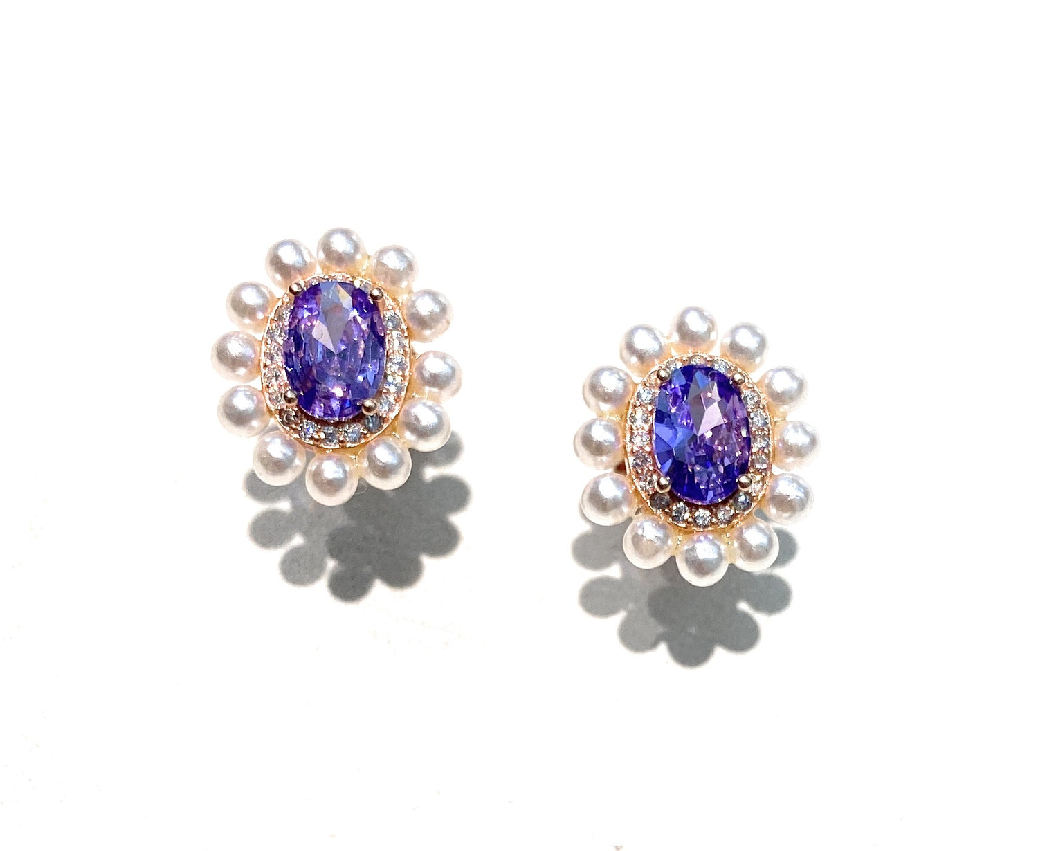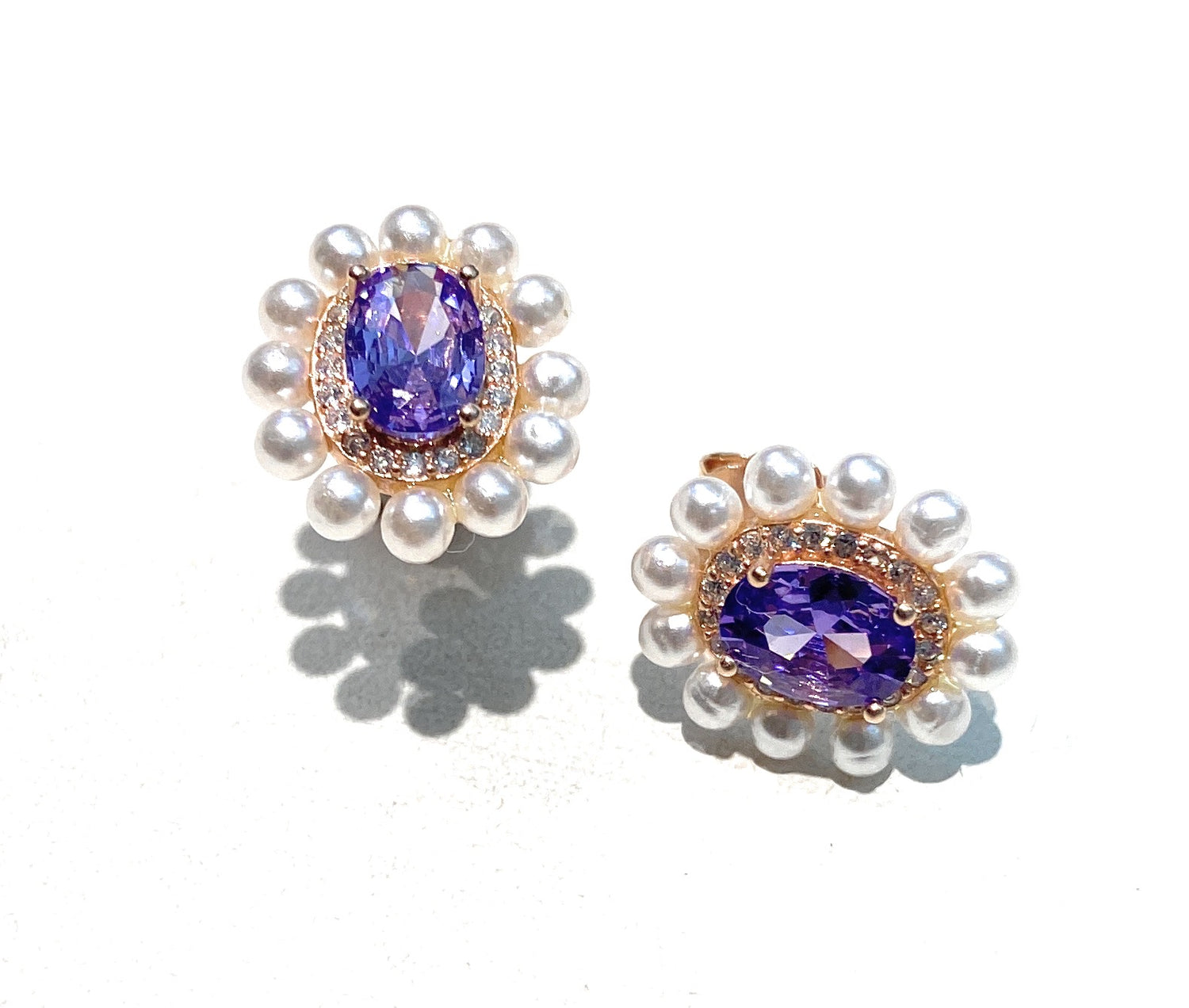 Al centro di ogni orecchino risplende uno zircone sfaccettato di alta qualità, disponibile in diverse tonalità come viola intenso e blu notte, incorniciato da una delicata montatura dorata.