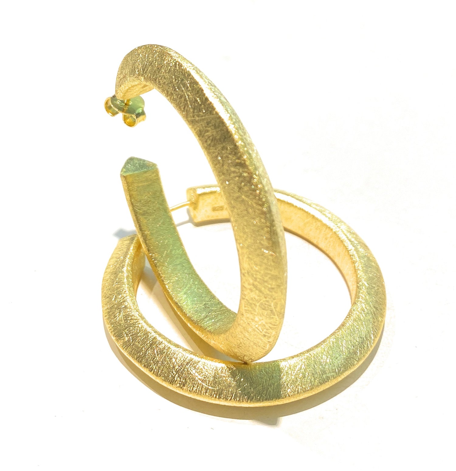 Questi splendidi orecchini a cerchio in argento 925 con placcatura in oro giallo sono il perfetto connubio tra eleganza classica e design contemporaneo.