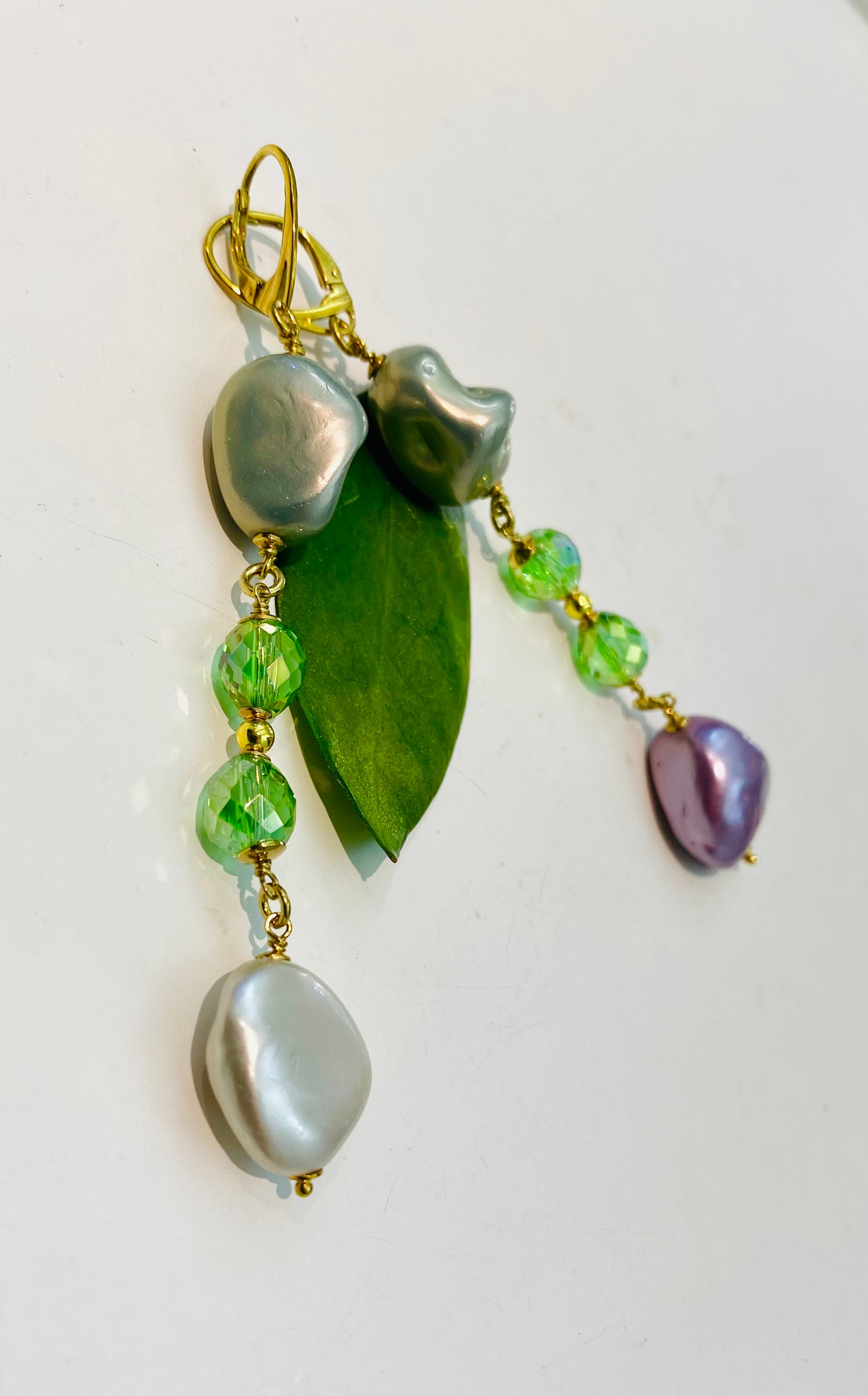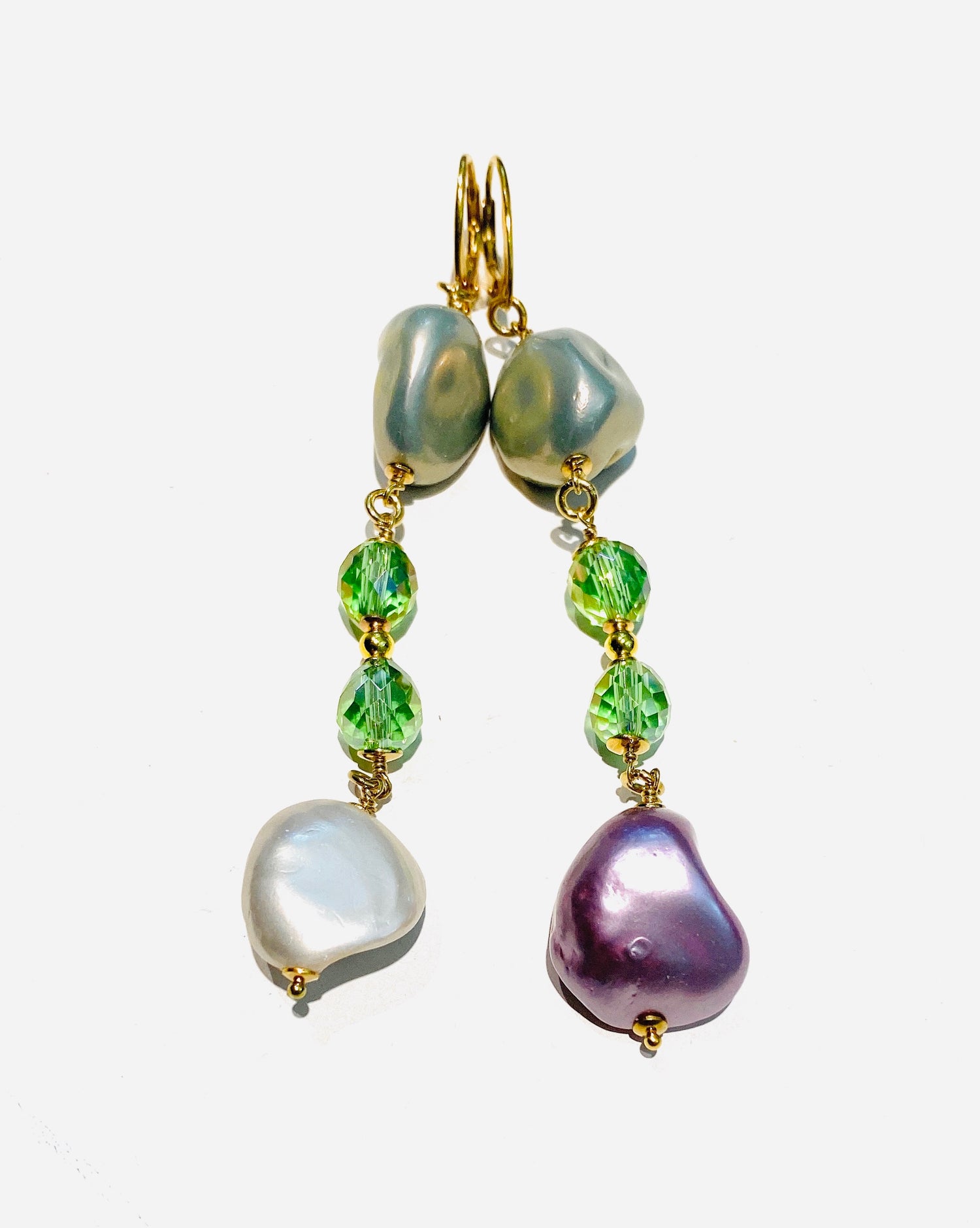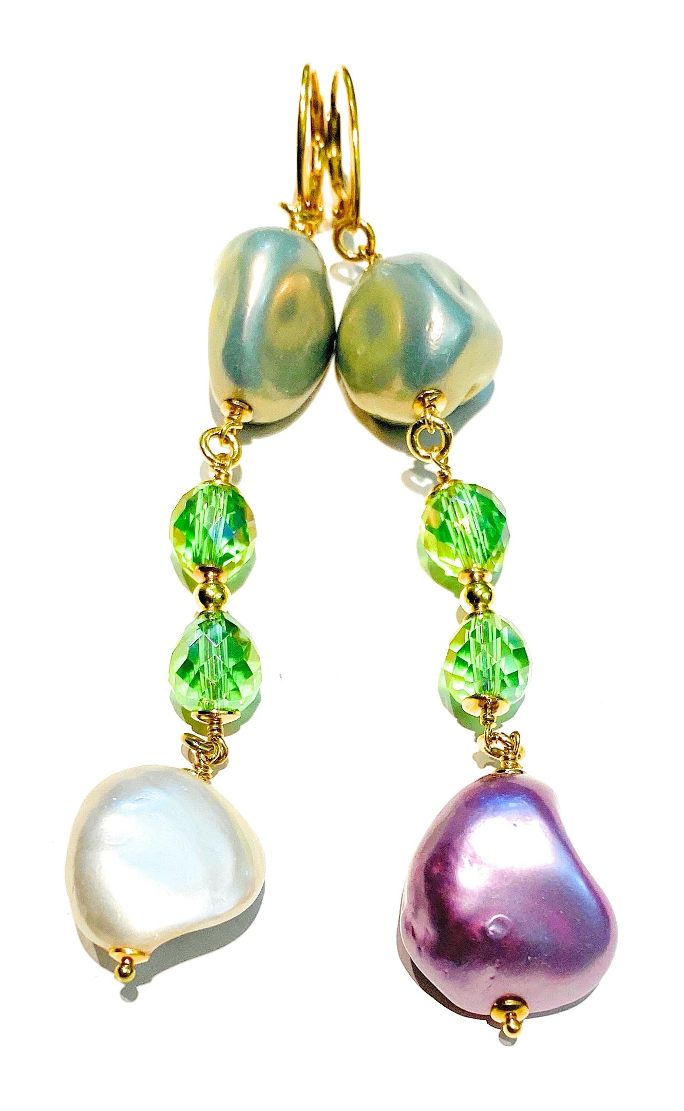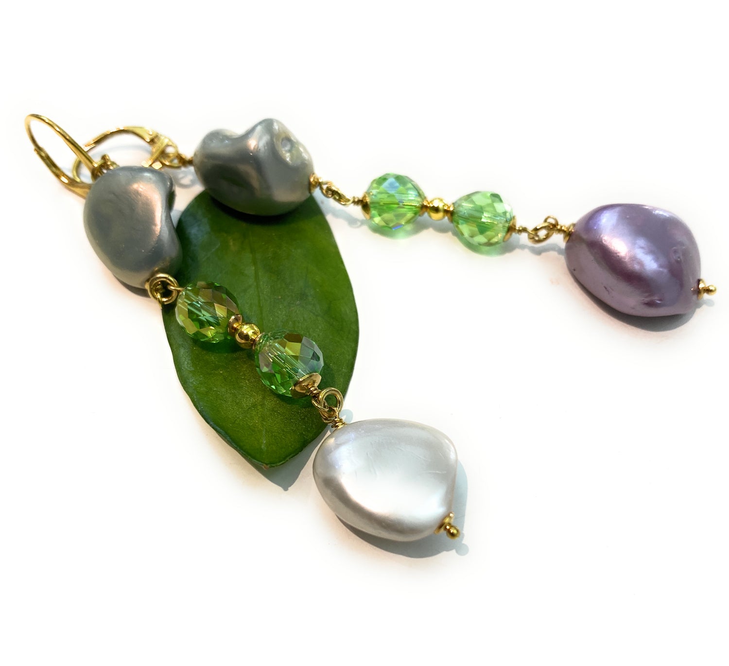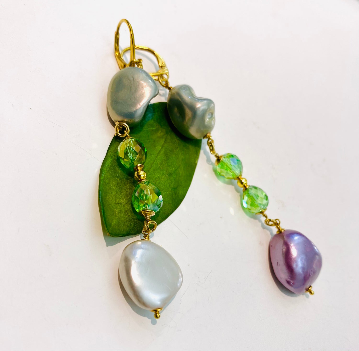 Questi orecchini firmati diWa Jewels uniscono la bellezza naturale delle perle irregolari di Maiorca (14–18 mm) nei toni pastello alla brillantezza dei cristalli goccia sfaccettati verdi (8×8 mm). Realizzati in argento sterling 925 con galvanica oro giallo, sono completati da una pratica chiusura a monachella che li rende comodi e sicuri da indossare.