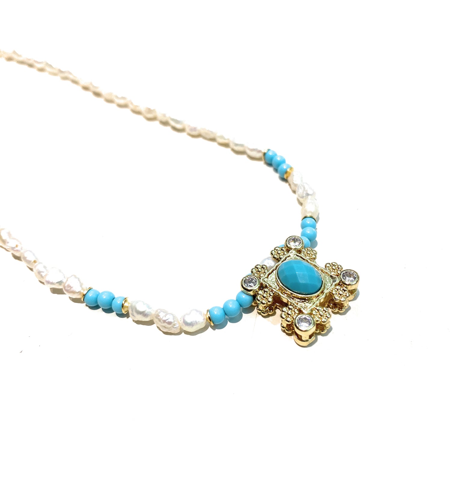 Stile raffinato e luminoso: l’incontro tra le perle di fiume e il turchese regala eleganza e freschezza.